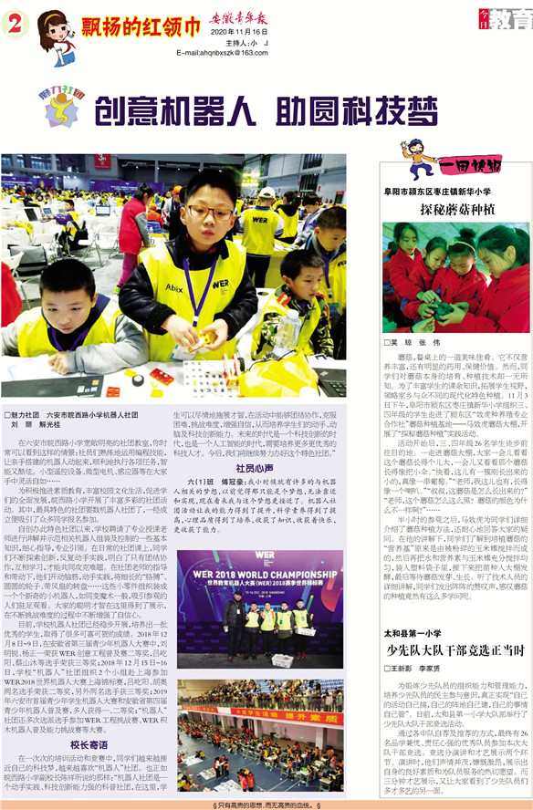 《安徽青年报·学生周刊》励志启智,开阔视野,净化心灵,陶冶情操,参与互动,集新闻性、知识性、趣味性、互动性为一体,是小学生成长的良师益友、参与互动的平台、沟通老师家长的纽带。