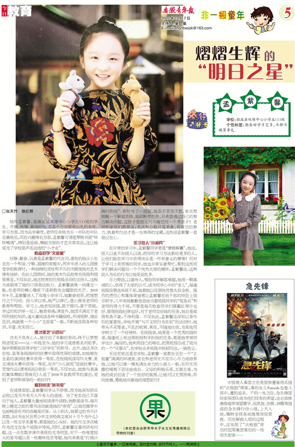 《安徽青年报·学生周刊》励志启智,开阔视野,净化心灵,陶冶情操,参与互动,集新闻性、知识性、趣味性、互动性为一体,是小学生成长的良师益友、参与互动的平台、沟通老师家长的纽带。