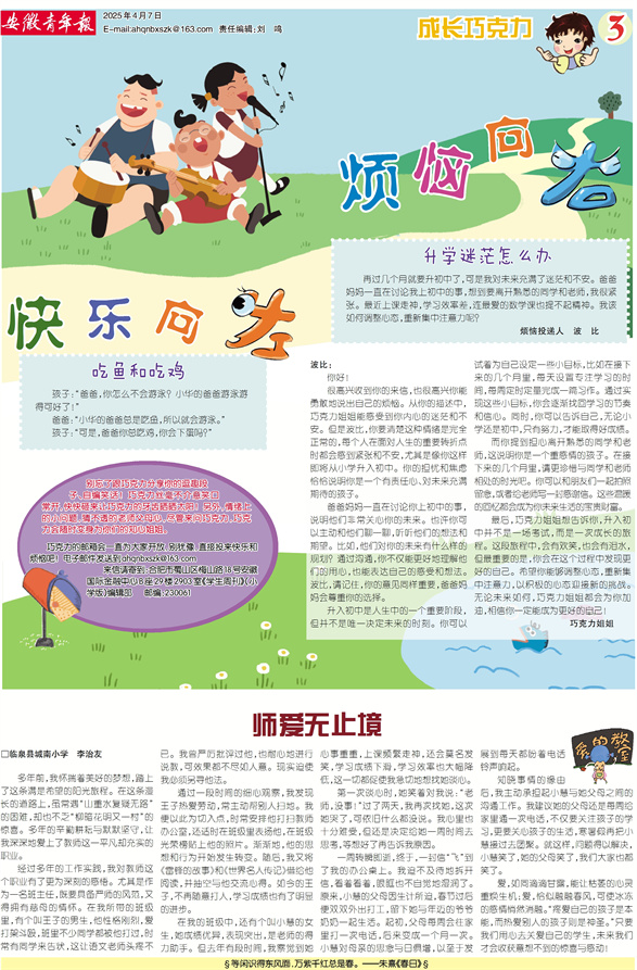 《安徽青年报·学生周刊》励志启智,开阔视野,净化心灵,陶冶情操,参与互动,集新闻性、知识性、趣味性、互动性为一体,是小学生成长的良师益友、参与互动的平台、沟通老师家长的纽带。