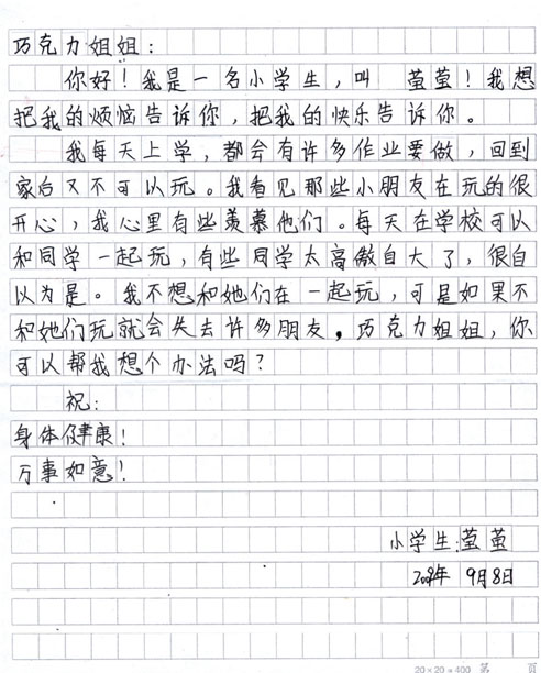亲爱的莹莹: 你好!巧克力收到你的烦恼了。 很多同学升入高年级以后,随着课业的加重,都会觉得玩的时间越来越少。 巧克力建议你调整一下学习方法。 比如课前好好预习,课堂认真听讲,写作业前先温习,做功课时不能三心二意。 虽然这些都是老师经常挂在嘴边的学习方法,你可千万不要小瞧它们哦。只要你做到了这几点,巧克力相信,你的学习效率一定会提高!玩的时间不就更多了吗? 至于你说的同学不好相处,也不用过于担心。莹莹只要敞开心扉和大家交往,你的朋友就会越来越多。 祝你开心! 巧克力 2009年9月28日