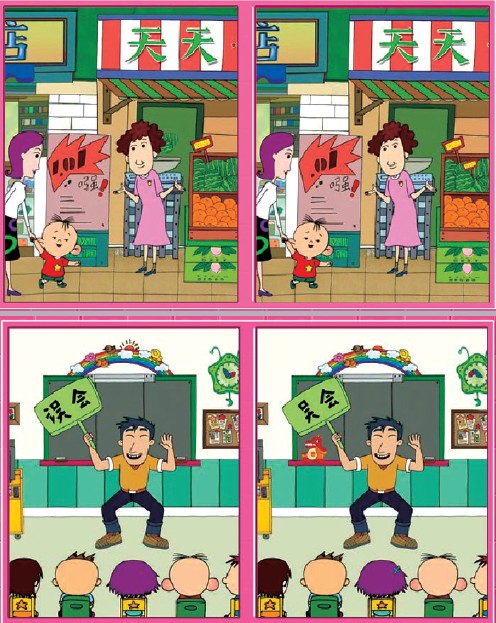 我们来找茬 恶魔的封印 小捣蛋鬼图图欢快地走在放学的路上,一个金黄色的玻璃瓶霎时吸引了他的眼球。图图急冲冲地走上前打开了瓶盖,可刚用了一点力气就拧开了瓶盖,一股流光立马飞了出来。幸亏图图见多识广,不然早被这阵势吓到不行了! “哈哈,你就是捣蛋鬼图图吧,我是被封印的恶魔,多亏你的帮助啊……” 没等图图弄明白,恶魔就一溜烟闪了,这可吓坏了图图,怎么能让恶魔在地球上乱窜呢?图图边想边找图书馆里的智者,智者说:“恶魔每次逃出封印都会出两关找茬游戏,只要你的眼力比他强,他会自愿被封印。”下面的两幅图就是恶魔出的难题,每幅图各有五处不同,昊昊相信报纸前的你们一定能帮图图打败恶魔的!
