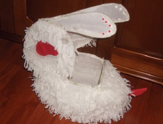 嫦娥仙子的一身素白霓裳让她分外脱俗,玉兔的一身雪白外衣当然也不能马虎。选用白纸做衣服,记得做好后把毛的那边揉一揉,这样会显得比较自然。身体和头部的纸要分别粘合,穿上素衣的玉兔就差眼睛和嘴了,之前准备好的贴片要发挥用处了。(千万别把身体全部糊上,要留一个开口点灯。)