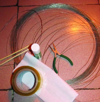 主要材料:铁丝、胶水、白色胶带、装饰贴片、饮料瓶盖、白纸(可以用包鞋子的白纸)、尼龙绳若干、老虎钳、夹子、蜡烛等。