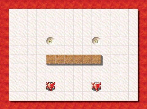 送螃蟹回家 一对要好的朋友,你总能发现他们同手同脚行动,这叫默契。螃蟹也一样,你看,两只长相雷同的螃蟹兄弟要回家了,可是改不掉一同移动的习惯,怎么越过中间墙的阻挡回到家呢? 注意:四周的红色火坑会将螃蟹烤熟,千万别掉进去。 提示:想要缩短螃蟹之间的空格,就得依靠中间墙,墙会暂时阻碍螃蟹兄弟一同行动。赶紧开动脑筋,帮助它们回家吧!