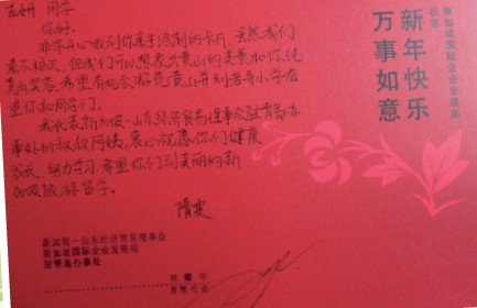 对此,六(3)班庄妍同学双手赞成,她也希望能与对方常联系,成为笔友,多了解外面的世界、对方的风土人情。她的明信片邮寄给了新加坡经贸理事会驻山东青岛办事处,她不仅收到了由理事会首席代表刘耀华先生亲笔签名的一张贺卡(见下图),还有两本精美书籍、一个笔记本。