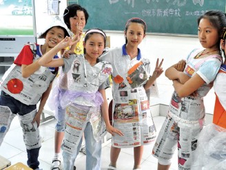 6 月4 日下午,合肥市新城学校五(2)班学生在班会课上进行了别开生面的环保时装走秀,迎接世界环境日。瞧,环保小“模特”们走起猫步来是不是很有范呢?