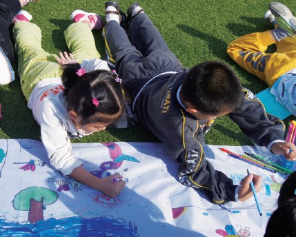 9月14日是世界清洁地球日,当天下午,合肥市朝霞小学举行了“小手绘地球”活动。图为一(3)班小朋友们在学校操场上的白布上画出自己心中的美丽地球。