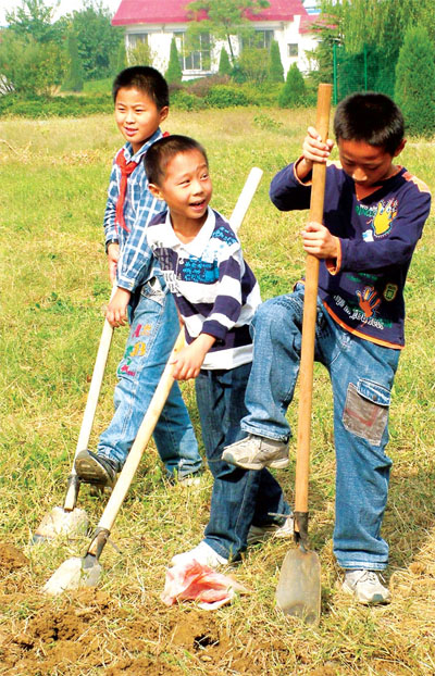 看看我们三个,劳动的范儿十足吧?牛仔裤、运动鞋,这身装扮就是为干活做准备的。我们的任务是给脚下的这片土地松松土,说起来容易,做起来难度可不小。插锹、铲土,每一步都要仔仔细细才行。告诉你哦,用铁锹可是个技术活,握的太近使不上力,握的太远又不好铲土。我们三个就一边劳动一边交流经验,还相互鼓励:“使劲,使劲,再使劲!”