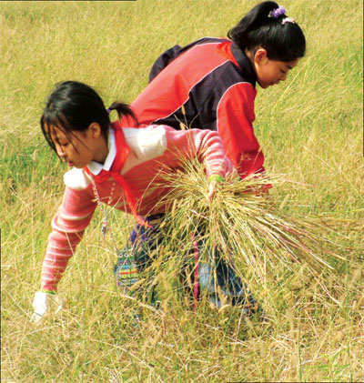 这位同学的任务就是送草。眼看一组的小草垛快赶上了,那边负责收草的同学不停地喊: “送草的,快点!”Oh,my god!她以百米赛跑的速度来了!