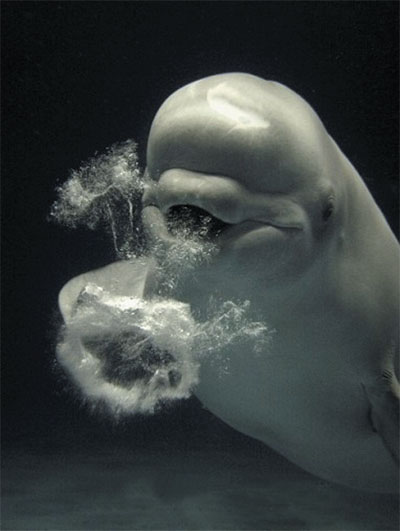 生活在日本岛根县水族馆的一头白鲸就对吐泡泡情有独钟。它从气孔喷出大量气体,在水中形成一个甜甜圈状的环形泡泡,而后,它便在泡泡下方尽情翻转身体,用鼻尖亲吻自己的作品,就像在表演水下芭蕾一样。
