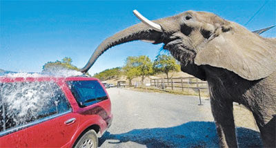 它们名叫爱丽丝和提基,用鼻子往车上喷水,然后用海绵擦拭,这种新颖的方式使游人能在车里近距离地观看大象为他们服务。