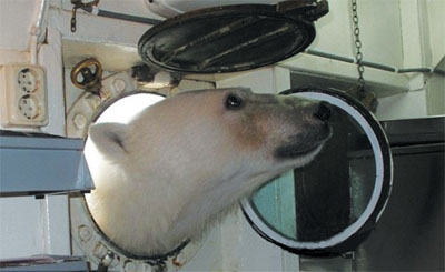 “有人在家吗?”一只北极熊偷偷将头伸进游船的厨房,寻觅美食。