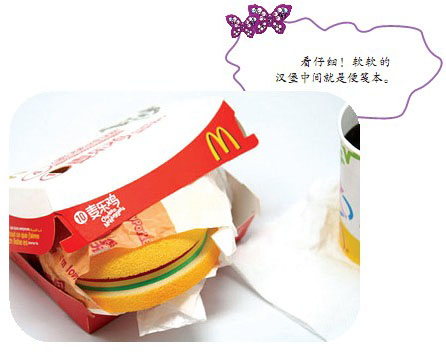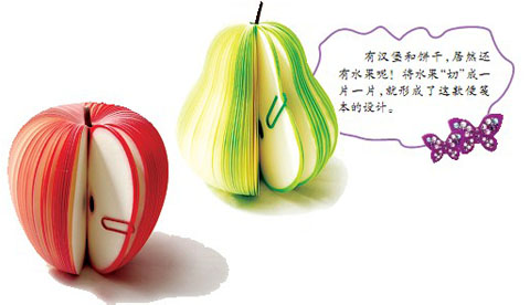 除了中规中矩的方格本、练习本,你有没有想过在汉堡、苹果上写字?我可没有开玩笑哦,这些都是我在同学们的书包里找到的便笺本、便笺纸。它们伪装成食物的样子,让我馋了好一会儿才发现自己被骗了!