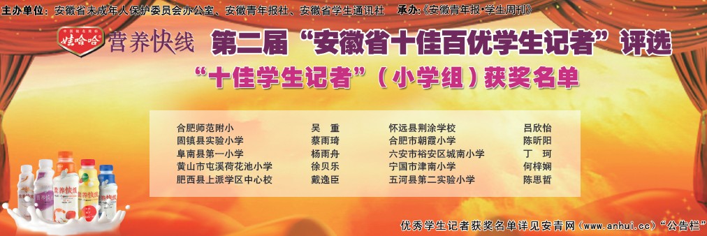 《安徽青年报·学生周刊》励志启智,开阔视野,净化心灵,陶冶情操,参与互动,集新闻性、知识性、趣味性、互动性为一体,是小学生成长的良师益友、参与互动的平台、沟通老师家长的纽带。