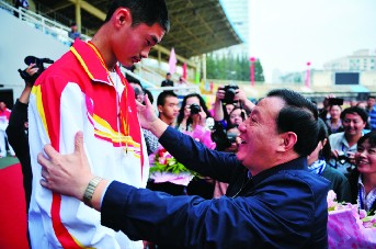 安徽省副省长梁卫国为摘得首金的特奥运动员李长彪颁奖。