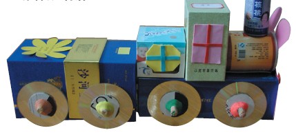 2.将旺仔牛奶瓶(圆柱体)、茶叶盒(长方体)、化妆品盒(正方体)依次粘在低的酒盒上,做火车头,牛奶瓶要横着放并粘牢。