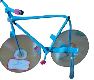 材料:酒盒两个(一高一低)、小的茶叶盒、易拉罐、化妆品盒、废旧光盘8个、木棍4根(粗细和光盘中间的孔吻合)、吸管一根、卡纸、废旧纸袋、裁纸刀、剪刀、泡沫胶、双面胶。