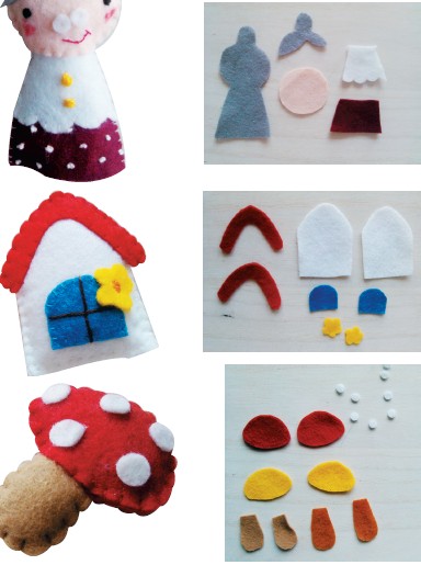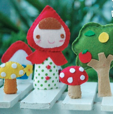动手,动脑,想法妙! 缝出来的故事 黄小鱼姐姐说了想要表现一个故事,就得把故事的主角和背景都想清楚,接着就是一个个地准备这些材料。下面就跟着黄小鱼姐姐一起来做手工吧! 小红帽出场 2.然后把脸部缝到帽子上,再与另一片帽子相对缝合,留底部先不缝,塞入棉花后再缝合。 3.把衣服如图反面相对缝合, 留底部不缝。 4.从底部翻到正面,整理平整,把斗篷缝在衣服上,衣服上钉两个小扣子。 5.在背后缝上斗篷后片。 黄小鱼姐姐的不织布是不是很神奇,接下来就是你自己动手的时间了,外婆、蘑菇、树、大灰狼的制作过程就不传授了,相信聪明的你一定能够搞定! |