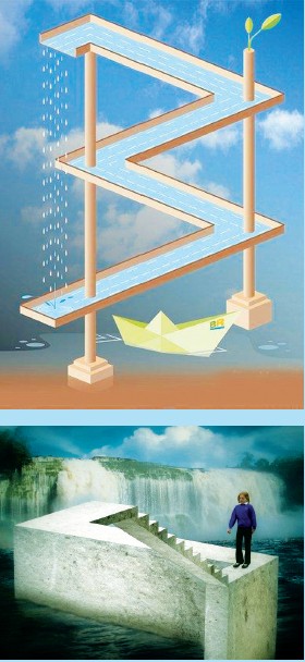 超级大头王 答案:其中的破绽就是,这两幅图根本就是不可能图形,第一幅中的水循环不可能存在,第二幅的循环走更不可能实现。所以父母不要欺负小孩子不懂空间图。 |