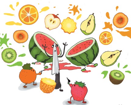 果园凶杀案 水果警方接到紧急通知,一把精神病发作的水果刀在果园里发起了疯:见到水果就砍,果园里现在到处都是受伤的水果们,果汁流成了河…… 警方迅速出动,很快就控制住了水果刀,现场一片狼藉。现场勘察随即展开,糖果给现场拍了一张照片。在被切开的水果堆里,能拼凑几个完整水果?(答案下期找)