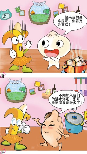 无论去哪儿,什么天气,记得带上自己的阳光。 漫画故事会 常听人说,己所不欲勿施于人,言下之意就是自己不喜欢的东西就不要强加给别人,别人会稀罕你不要的吗?其实不仅仅是自己不喜欢的,即便你喜欢,也难保别人会喜欢。包子的桑拿房、饺子的沸水浴、面包的烤箱都是它们的最爱,为什么香蕉拒绝它们的好意呢?原因很简单,这些“好处”几乎得要了她的命,一罐沙拉酱才是她的最爱! |