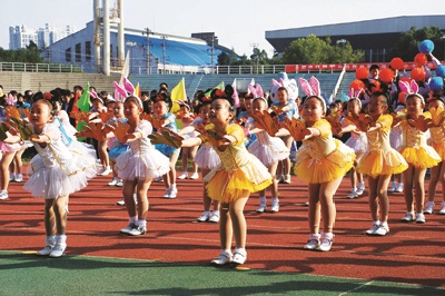 合肥市瑶海区的运动会开幕式上,少儿艺术学校的同学们也好好秀了一把,不仅将“凯蒂猫”和“米老鼠”请来了,两个小姑娘还扮成了美丽的小仙女,和大家一起载歌载舞,庆祝盛会。