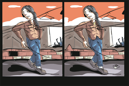 流浪汉在街头慢慢地走着,突然一阵大风刮过来,从天上的云彩到街上的景致,甚至连流浪汉自己都被风吹得变了形。大家找找看,大风过后,他和它们都有什么变化?
