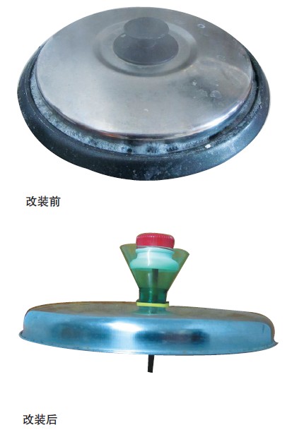 通过观察我们发现汤水溢出的原因主要有两个:一是对比烧水时冒出的气泡,烧水时气泡小且均匀,一般不会溢出来,而煮饭或烧汤时汤水比较粘,出现的气泡不易破裂,所以容易溢出来;二是煮饭时气压比较大,很容易把锅盖顶起来,锅盖一起来汤水就会溢出来。根据以上原因对锅盖进行了改进,制作出模型并对效果进行验证。最后将半截饮料瓶倒置装在锅盖上,在里面放个插有半截筷子的盖子。
