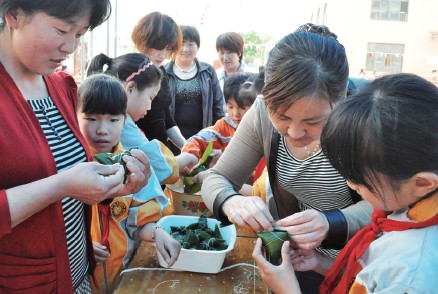 近日,合肥市五一小学端午文化课堂上,来自合肥市汲桥新村社区的社区妈妈们现场教小学生包粽子,迎接6月12日(农历五月初五)端午节的到来。