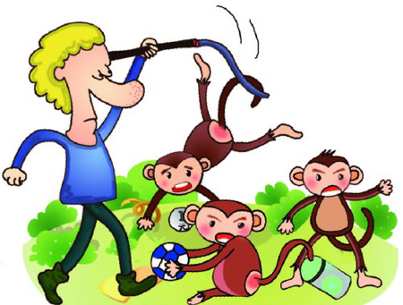 街角的一块空地上,一位面相丑陋的耍猴人,手里甩动着皮鞭,不停地吆(yāo)喝着,旁边拴着几只骨瘦如柴的猴子。 |