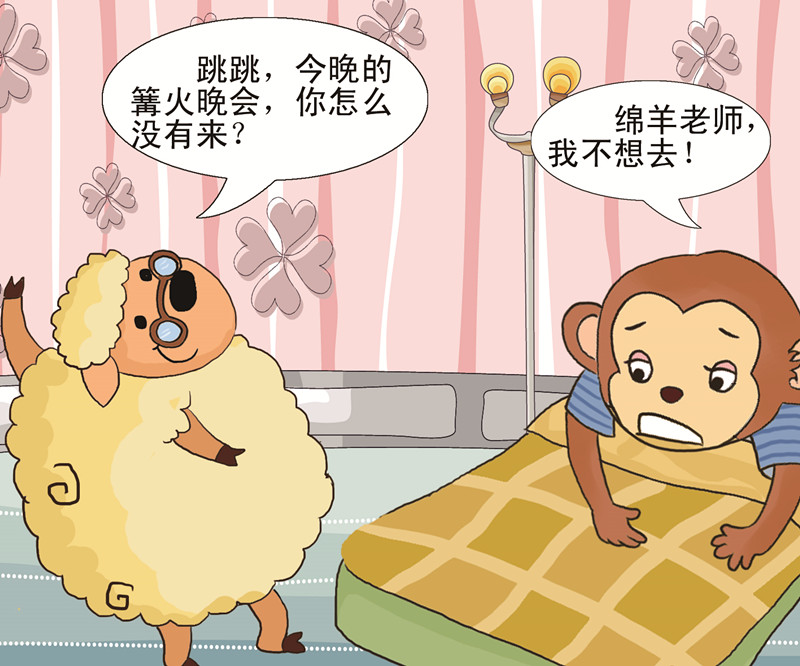 新的一学期来临,大森林的小动物们准备了一场特别的篝火晚会。大家伙邀请了很多小伙伴一起参加,可是唯独小猴子跳跳没有来。绵羊老师准备亲自去看看,这到底是怎么回事呢?