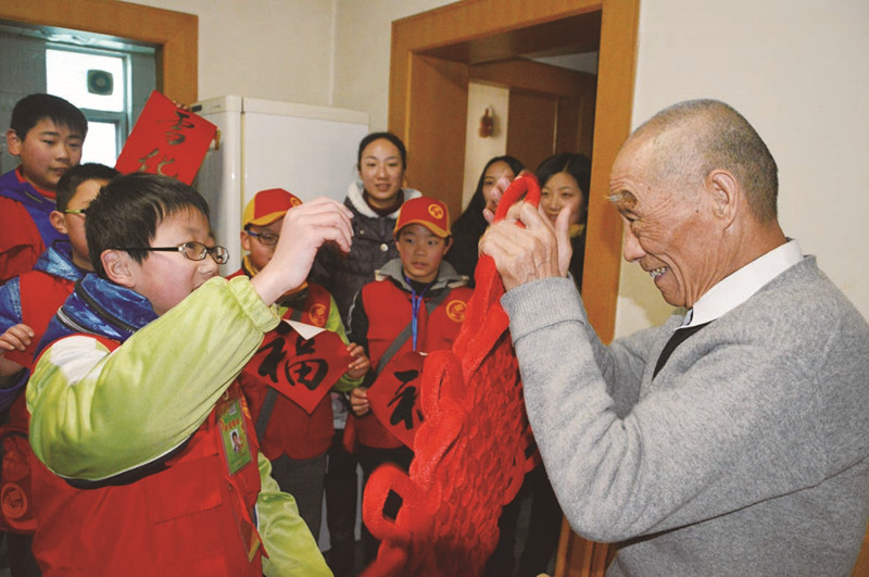 王绪冉:新年里,我们带着对联和中国结,去看望年近九十岁独居的陈奶奶。奶奶见我们到来,笑得合不拢嘴。看着奶奶高兴的模样,我们也在心里定下计划:要经常来看望奶奶,让她不再孤独。我们三实小要与老奶奶一起,手牵手、心连心呢!