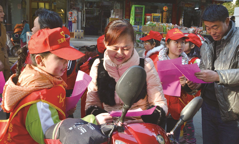 王梓鹏:有一次,服务队开展环保活动。我在清理街道垃圾的时候,碰到一位叔叔将烟头随手一扔,我鼓起勇气上前制止。没想到,我一个小孩竟能劝动大人,这更增加了我的信心。于是我下定决心,一定要做一名合格的志愿者!