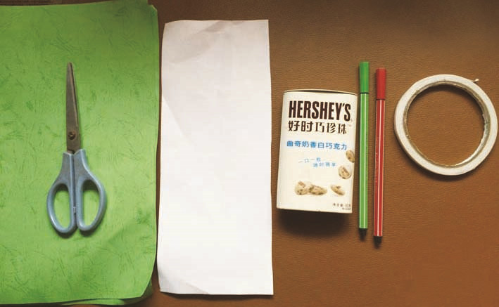 Part1:萌兔储物罐 1.首先准备好需要的材料,包括剪刀、卡纸、彩笔、巧克力盒子、双面胶。