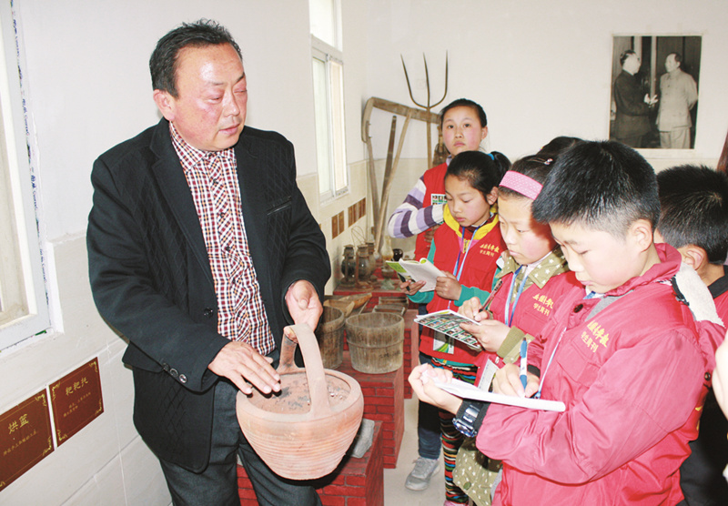 长丰县陶楼乡新丰村村书记陈来福伯伯在为小记者讲述烘篮的历史