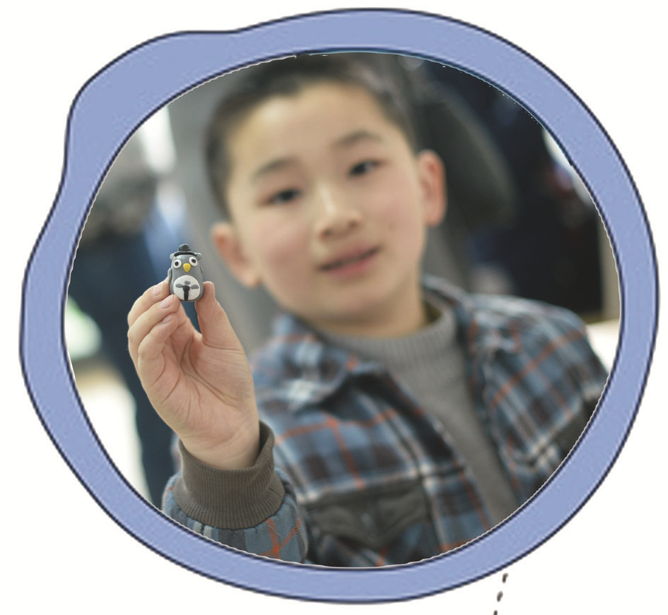 高思睿:软陶的制作并不复杂,就拿我选择的忧郁小蘑菇来说:首先将紫色的软陶搓成一个圆球,搓的时候表面不能有裂纹哦。老师说一旦有裂纹,烤制时作品就会裂开。圆球轻轻压扁,就是蘑菇的头。用咖啡色的软陶做成蘑菇的柄,再加上五官等零件。蘑菇进烤箱烘烤10分钟后,忧郁小蘑菇就新鲜出炉啦。