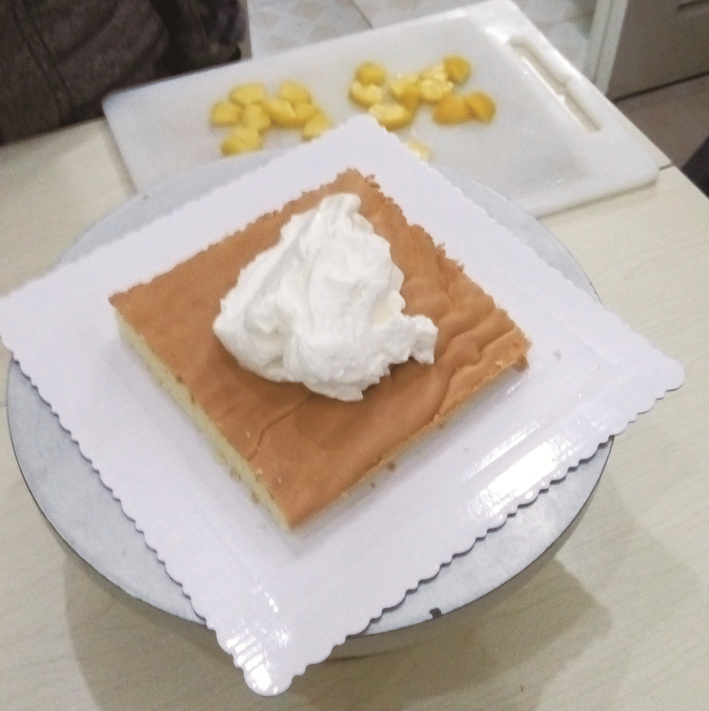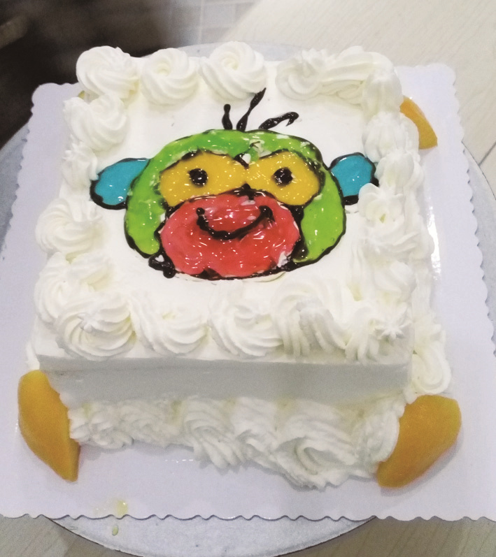 2.第一层奶油抹匀后,放入切碎的水果黄桃,再放上另一块准备好的蛋糕,加入鲜奶,用刀尖平推奶油,使整个蛋糕全被奶油包住。 3.完成后,师傅在奶油蛋糕上用尺子沿蛋糕周围画了边框,裱花不能超过边框。今年是猴年,我们用牙签在奶油蛋糕上慢慢地画了个猴脸,然后用巧克力勾边,再用自己喜欢的颜色着色。 4.着色后,师傅教我将鲜奶油装入小喷枪,挤出带波浪的奶油花边围在之前不许超过的边框上,装饰蛋糕,再在蛋糕的四周放了水果黄桃。 哈哈,我的DIY蛋糕就这样做好了,还可以吧。看似很困难,但只要细心还是可以的,亲爱的同学们,你们也赶快试试吧! |