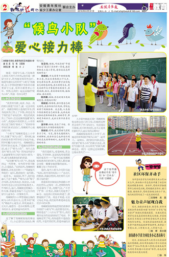 “小候鸟”蒋婉妮是在上小学时,创建了“候鸟小队”。那时候,她的班里有很多同学的父母在外地,同学们整天闷闷不乐。蒋婉妮想让同学们快乐起来,于是就向老师申请,成立了“候鸟小队”。为什么取名叫“候鸟小队”呢?因为这些留守儿童就像等待父母归家的小候鸟一样,候鸟承载着他们的希望。
