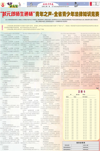 1.书面答题:填写答题卡(答题卡可复印)参赛。答题时,将所选正确答案在答题卡前面“○”内打“√”。学校统一将答题卡及集体参赛表邮寄至合肥市长江路419号安徽青年报社刘凤华收。截止日期为2016年12月30日。