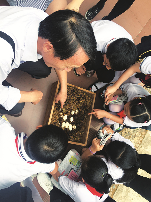 六(1)班 郭 莹:没来之前我以为鳄鱼是“凶猛的兽类”,是哺乳动物的。没想到它是靠蛋延续“香火”的。为了防止人员或同类的破坏,保护区工作人员一般会用铁丝和一些花花草草把鳄鱼蛋给围起来。它们并不需要鳄鱼妈妈像母鸡孵小鸡那样,而是在自然环境下孵化,大概需要60天左右。