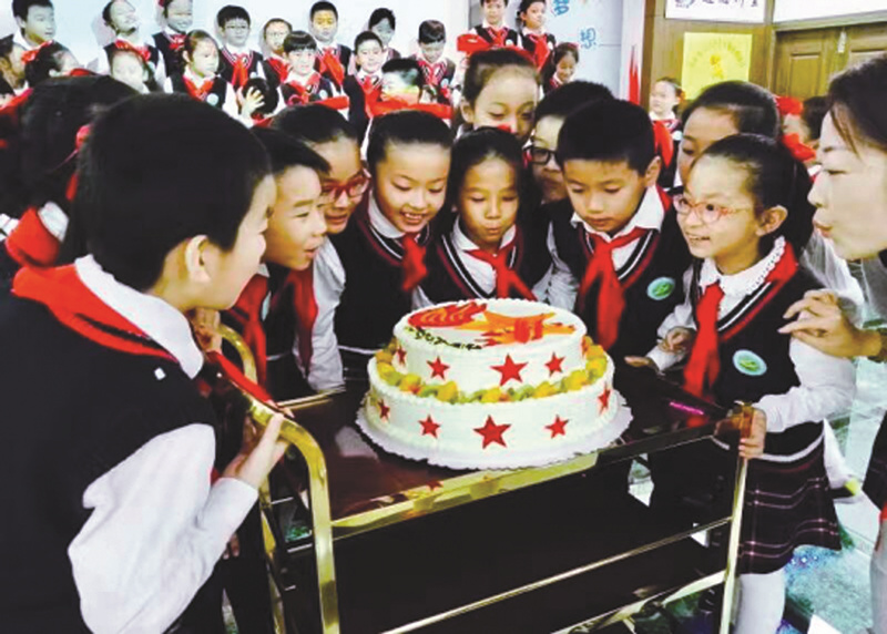 少年先锋队生日快乐 铜陵市映湖小学少先队员准备了大蛋糕,点亮了生日蜡烛,祝福全市少先队员、少先队工作者,祝福中国少年先锋队生日快乐!