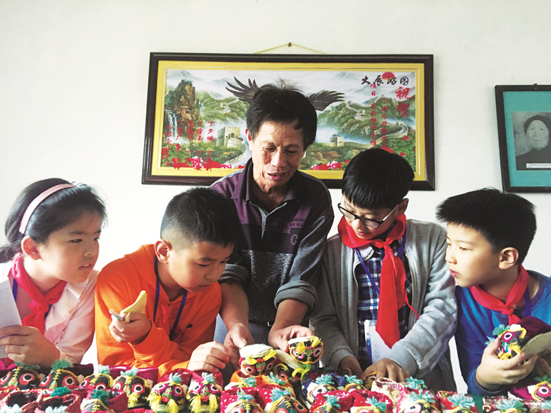 传承人正在给小记者讲解虎头鞋的制作过程