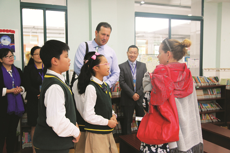 在现场活动中,三名“小外交官”积极配合、相互补充,两名外国校长对这种有趣的迎宾方式特别赞赏。他们在三名“小外交官”的陪同下参观学校设施设备、欣赏学生科技创新及美术作品、与乒乓小将打乒乓球。初生牛犊不怕虎,中国小学生竟然不给这个外国校长“面子”,几个回合下来就击败了他。同行的Lisa校长背了一个超大号的包包,里面装满了铅笔、手环等小礼物,礼物虽然简单,可同学们却视若珍宝。