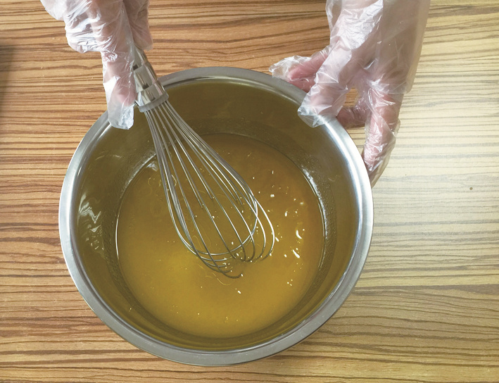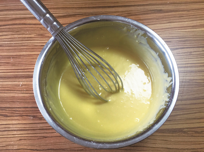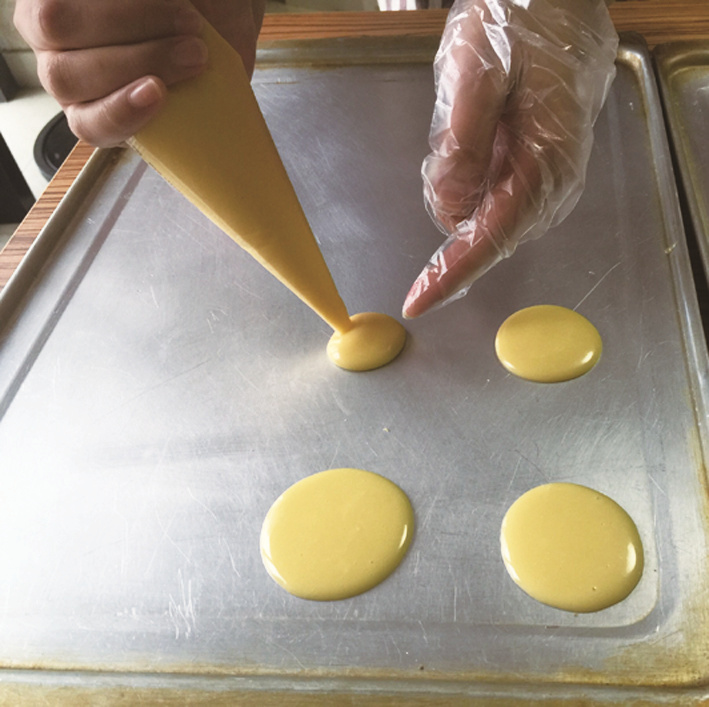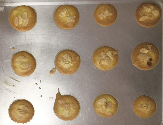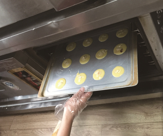6、接着我们在圆形面糊上加上杏仁片,杏仁片的多少根据个人口味可以调整,不过在放入时一定要小心哦! |
