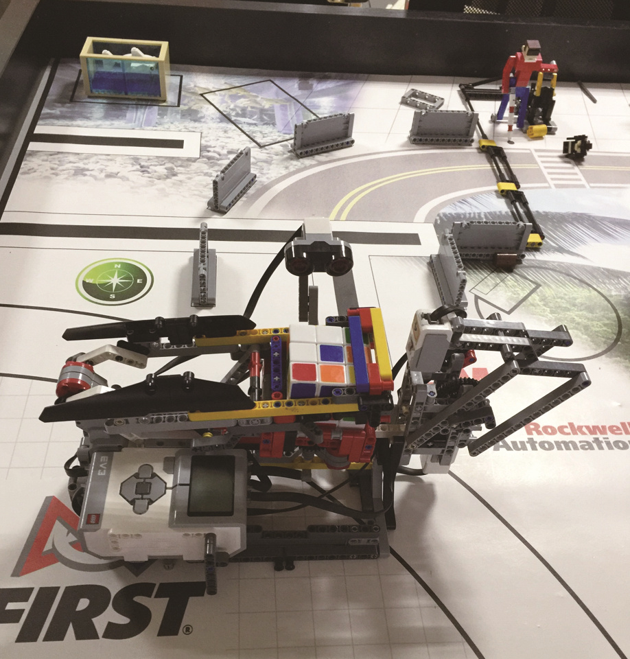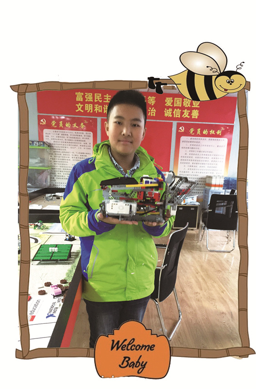 姓名:王思棋 年龄:12岁 班级:合肥市安居苑小学六(4)班 性格:开朗、活泼、好动 爱好:机器人、读书、运动、旅游 崇拜的人:本杰明·富兰克林 人生格言:决心就是认准了就要全力以赴、坚持到底 我是一个开朗、活泼、好动的阳光男孩,喜欢读书和运动,也很享受与家人、朋友一起旅游,但最喜欢的还是待在我们学校机器人社团的机器人教室里,跟同学们一起完成一个又一个机器人作品,很有成就感。 看,我们最新的研究成果是一个“魔方机器人”,它的本领可不小噢!“魔方机器人”的灵感来源于我的一个小烦恼:家里有一个魔方,但我总是解不好。于是,我想着能不能用机器人来解魔方呢。在想法还不知道怎么付诸现实的时候,我在科技馆见到一台人形的解魔方机器人,解起魔方来令人眼花缭乱,不亚于真正的解魔方高手,这更加坚定了我利用机器人解魔方的想法。 在社团方老师的指导下,我与同学们一起开始了“魔方机器人”的创作。起初,程序编程很让人头疼,虽然大部分的程序是从网上查找下载的,但有些部分需要改动,这就需要花费大量的时间和精力研究和熟悉编程方法。另外,“魔方机器人”的某些稀有零件很难找,只好用其它零件代替。我跟同学们在安装许多小零件时,为了对应安装,手指被划破是常有的事。 虽然困难重重,但还是很开心的。我经常利用课间时间去机器人教室拼装“魔方机器人”,有一次为了一个局部的改动,我在机器人教室里待了整整两节课,把上课忘得干干净净,结果被同学们嘲笑说“走火入魔”。 在我们几个月的努力下,“魔方机器人”创作出来啦。它可是由乐高EV3零件拼装的手臂、控制主机、电机、超声波和颜色传感器构成呢。最快1分钟,它就能完全复原魔方的9个面。它还能把还原过的魔方打乱,拼出不同图案的花样魔方呢,神奇不! 通过机器人的创作,我学到了很多。不仅熟悉了简单的编程方法,动手能力和思考能力也得到了提高,最重要的是体会到了团队合作的重要性。我和同学组成的3人团队,配合得默契得很呢!