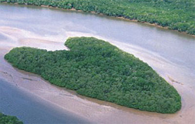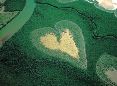 巴西巴里斯河流上的红树林岛屿,它长年累月地拦截着上游的泥沙,渐渐形成了一颗翠绿色的“爱心”。