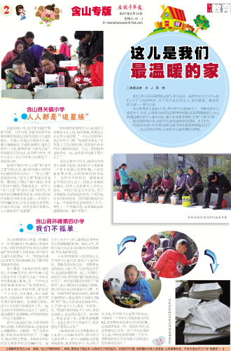 含山县环峰第四小学 我们不孤单 含山环峰第四小学是一所建校才一年多的城郊小学,副校长季道祥介绍:“我们学校的学生来自五湖四海!”学生来源于全国各地,其中留守儿童所占比例近一半。学校每年通过《家校互动问卷调查表》了解学校家庭基本情况。 张仁霞是一(4)班的老师,她的班上共有60名学生,其中有22人是父母在外务工的留守儿童。“大部分学生都能融入集体,有一个学生让我印象最为深刻。”张老师回忆,去年9月刚入学的时候,新来的一个小女孩,头发蓬乱,身上也脏脏的,还能闻到一股味儿,很多同学都不愿和她玩。在调查后得知,这个小女孩的父母都在外工作,一起生活的爷爷奶奶年纪也大了,导致几番沟通都不是很顺畅,对学校的教育工作也不是很配合。 留守儿童远离父母,与爷爷奶奶难以沟通,大都感到孤单,这是造成心理障碍的一大根源。为了方便沟通,学校为此特别申请了一个QQ号,现由季校长管理。全校所有学生的家长都是季校长的QQ好友。每天早上有半个小时,是季校长为学生家长答疑解惑的时间。除此之外,季校长每天还会在空间里发布校园新闻、学生表彰等信息。 六(1)班娄敏和六(2)班蒋心乐作为留守儿童代表,接受了小J的采访。娄敏在四年级之前,一直跟着爸爸妈妈在上海上学,“以前我过生日时,爸爸妈妈都陪我一起,三年级时,妈妈告诉我,明年他们就不能陪我过生日了。幸好他们提前给我打了‘预防针’,加上我的生活自理能力很强,所以回来后也没有感觉不习惯。只是一开始同学们说家乡话时,我听得不是很明白,现在我终于沟通无‘障碍’啦!”蒋心乐的爸爸在她6岁时,去了伊拉克当工人,现在一年回来一次。“两地时差相差6、7个小时,我们这边晚上,爸爸那边是白天。每天晚上,等爸爸闲下来,会跟我视频聊天。爸爸去那工作已经6年了,我希望他不要那么辛苦。” 一(6)班的班主任老师崔娟告诉小J,班上共有61名学生,其中留守儿童有37人。留守儿童最缺乏的是家庭教育,崔老师在学习、生活和卫生方面,给予留守儿童更多的关注。“班里有一个学生先天性的视力只有0.2,我安排他坐在讲台旁边的位置,让他离黑板近一些。我在板书时,也会特意往右边写。这个学生也是留守儿童,奶奶在家里照顾三个孩子。我跟他的家长多次沟通,目前他也正在准备接受治疗。”