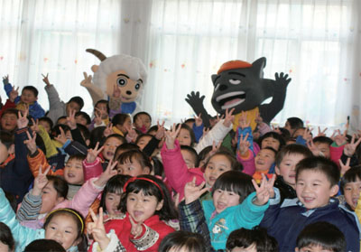 喜羊羊进校园了 3月9日,“喜羊羊和灰太狼”来到了合肥市双语艺术幼儿园,与小朋友展开亲密互动。