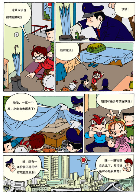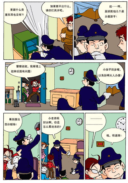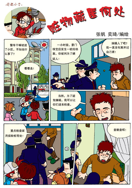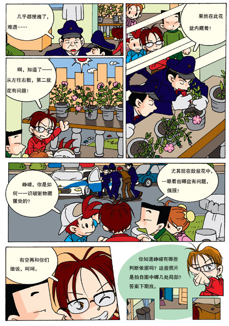 《进入画家居室的是谁》 答案: 1. 从被害人桌上削了一半的苹果看,这是一名左撇子削的,而倒地的画家握画笔的是右手。可见,另有人进入过画家居室。 2. 峥(zhēnɡ)嵘(rónɡ)让发现李先生倒地的那名男子写一下事发经过,其实是为了观察他是否是左撇子而已。可从其右手握笔、左手腕戴手表等方面发现他不是左撇子。另外,室内地上有与被害人鞋底图案不一致的脏鞋印。这是一种宽鞋印,与那名男子的窄鞋型也不一致。 3. 同理可辨别其余三名画商:第一名打手机的手势、戴手表的部位、鞋的宽度等情况都不符合嫌疑人特征;第二名虽然恰巧也是个左撇子,但其鞋型和底纹图案对不上号,也可排除;最后一名画商则全部能对上号。而且如仔细观察,其放在地上的一卷画稿缺了一角,这所缺的一角,可从李先生家找到。所以可锁定他了。 4. 两个镜头分别出现在图1的最后一幅图和图2的倒数第二幅图中,你看见了吗? 对于左撇子现象,专家们还没有明确的解释,但他们发现胎儿在母体里就形成了或左或右的习惯。利用特殊的超声波成像技术,他们发现如果胎儿在努力吮吸左手,将来就是左撇子。专家说在婴儿大脑发育的中后期,就有一些功能的变化了。因为右半部分大脑不仅控制左手,也决定人以后说话和写作的能力。研究显示,习惯使用左手的人比使用右手的人智商要高。