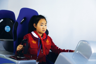 体验馆的老师们给小记者们讲解了飞机起飞程序及注意事项。解说完后,学生记者们开始一次模拟飞行驾驶体验。闫梓怡冲进驾驶舱,调整好坐姿,双手分别握住操作杆,双眼紧盯屏幕,准备自己的第一次起飞。只见她左手轻轻地推上油门,飞机缓缓地启动了,速度五十、一百、两百,飞机越来越快,突然眼前出现一座大山,她急忙拉起飞机,可是为时已晚,飞机撞上了山头,飞行失败。“拉升晚了一点,没关系,重新来过。”在旁的闫爸爸鼓励道。